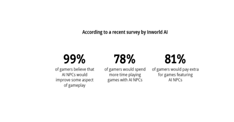 Finally, AI can introduce more and better non-player characters (NPCs) in games, thereby improving player satisfaction by making the gaming environment more immersive. According to a recent survey by InworldAI, 99% of players believe AI-based NPCs would improve some aspects of gameplay, 78% of players would spend more time playing games with AI NPCs, and 81% of players would pay extra for games with AI NPCs.