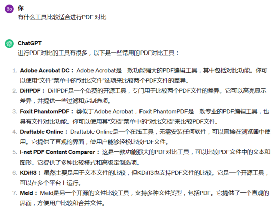 場景一:客戶需要一個 PDF 對比工具。在搜索引擎中即使寫了非常詳細(xì)的關(guān)鍵詞,也找不到合適答案。利用ChatGPT的自然語言交互功能,它可以針對問題給出非常有價值的回復(fù)。